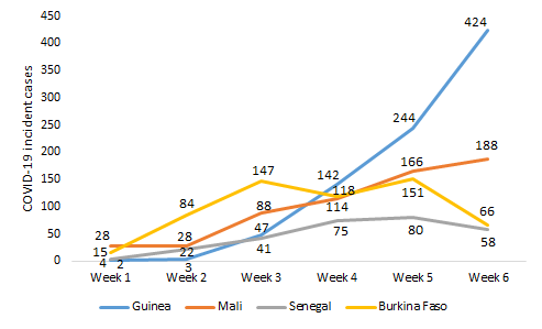 Senegal, Burkina Faso, Guinea, and Mali notified their first cases on March 02, 09, 12, and 25, 2020, respectively. COVID-19 had a different dynamic in the four countries ( Figure 1 ). In Guinea, its evolution was marked by an exponential rise in incident cases ranging from 2 (week 1) to 424 (week 6). In Mali, the number of new confirmed cases evolved gradually and linearly; it varied between 28 (week 1) and 188 (week 6). As for Burkina Faso, we observed a polynomial incidence of the pandemic, which increased gradually from 15 cases (week 1) to 147 cases (week 3), then decreased to 118 cases (week 4), increased to 151 cases (week 5) and dropped to 66 cases (week 6). In Senegal, we noted a moderate gradual incidence of the pandemic from 4 cases (week 1) to 80 cases (week 5), which decreased to 58 cases (week 6).