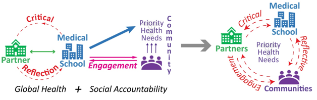 Global health and social accountability are two endeavours of 21st century medical schools that set them apart from their Flexnerian predecessors. In the Flexnerian model, medicine was approached as a scientific discipline, and thus the curriculum emphasized basic science and laboratory methods [1,2]. The new endeavours signal a shift in medical schools’ approach to health to include a focus on biopsychosocial factors [1], social determinants of health, and health equity. In this commentary, we argue that when global health and social accountability each draw on the strength of the other, these endeavours can be reinforced in a powerful synergy that enables them to realize their full potential.