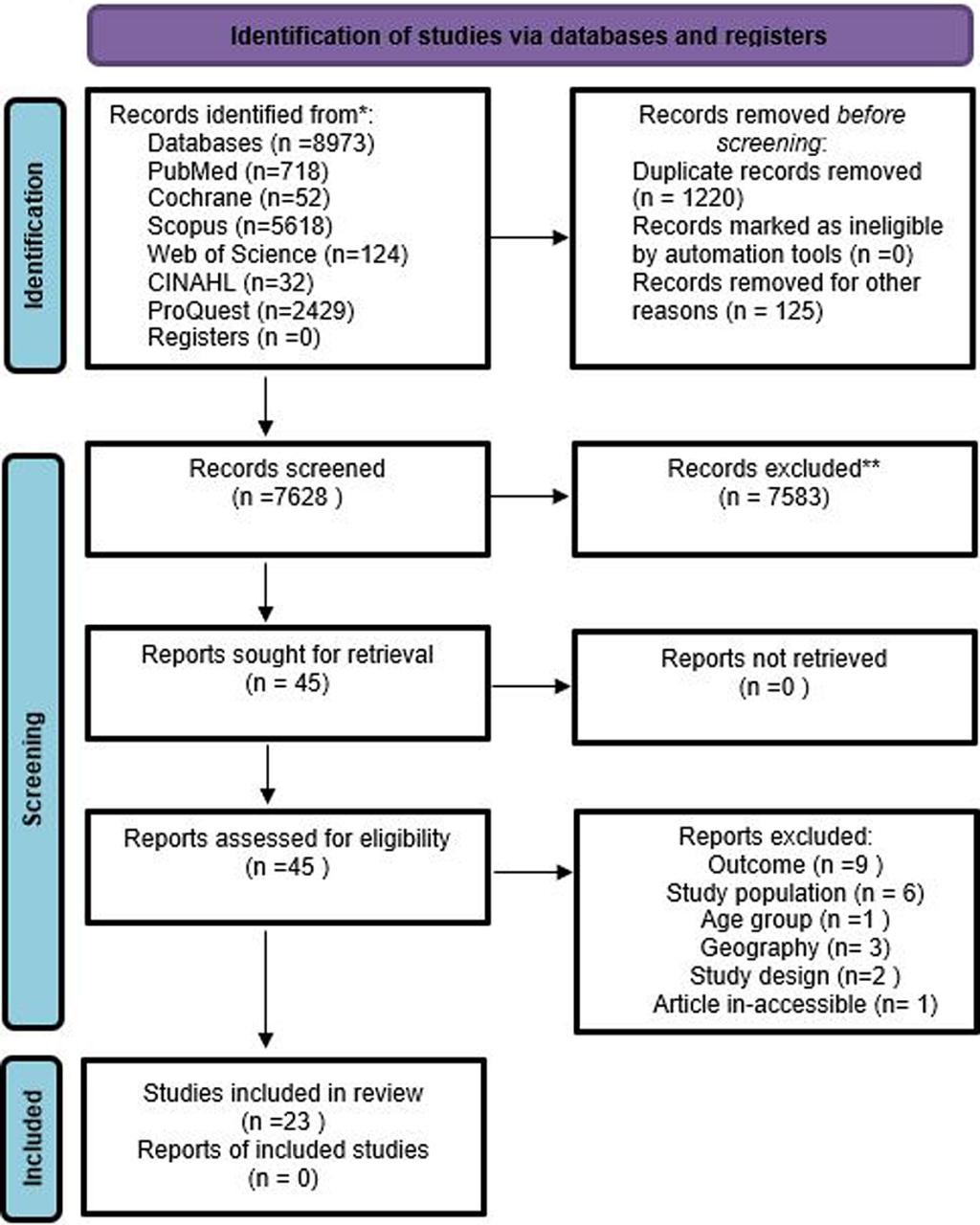 The initial search identified 8973 records of our interest. Based on our inclusion criteria, 45 records were included at the title and abstract screening stage. Of the 45 included studies (following Ti-Ab), 22 records were excluded and the list of excluded studies along with reason is provided in Table S2 of the Online Supplementary Document , and 23 studies were included for data extraction ( Table 1 ). No other study was identified through hand search of relevant bibliographies.