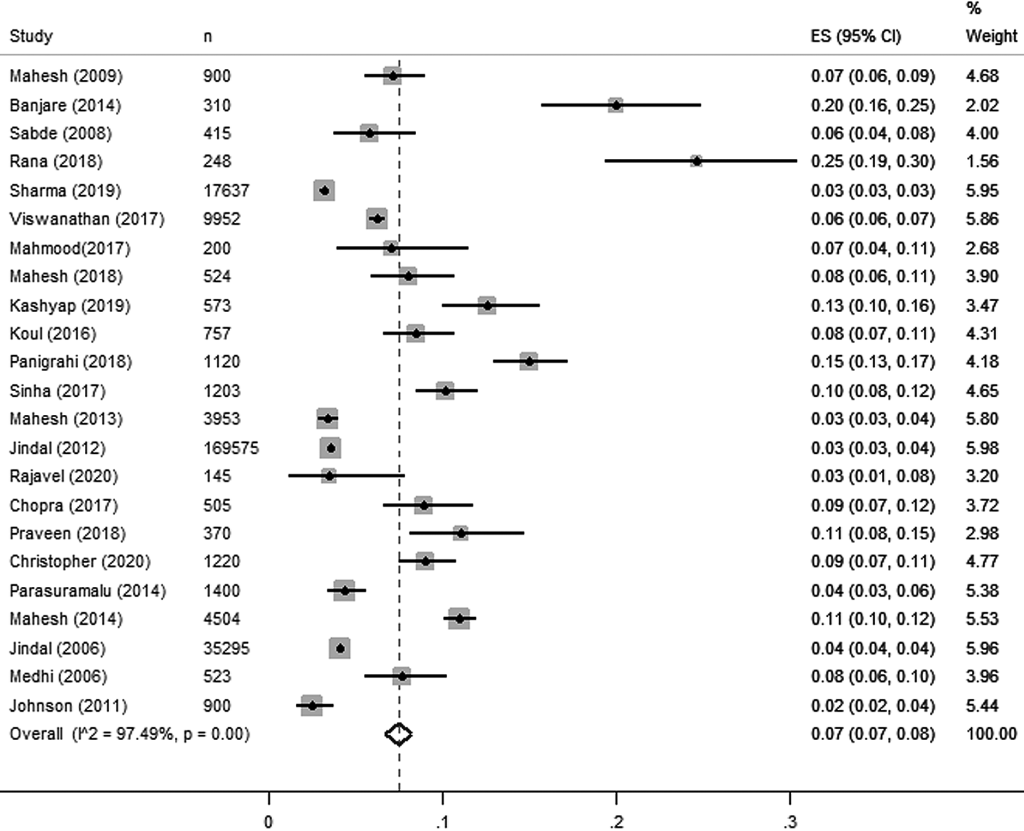 Pooled prevalence estimated for all studies is presented in Figure 2 . Overall, 23 estimates for COPD [studies including that reported either COPD – including both chronic bronchitis, or emphysema) with the sample size of 80 138 yielded a pooled estimate of 7% or 0.07 (95% confidence interval (CI) = 0.07, 0.08). There was higher heterogeneity (97.8%) observed among included studies as they followed observational study design.