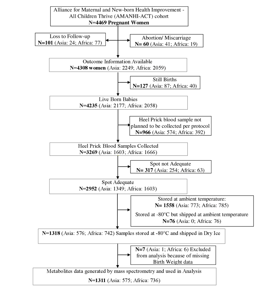 The All Children Thrive (ACT) extension of the AMANHI cohorts added follow up of new-borns until 3 years of age. As part of this change, a heel prick sample collection from neonate between 24 to 72 hours after birth was introduced to the protocol. Details of the cohort flow are provided in Figure 1 . Based on the quality control pilot analysis, only samples from 1318 new-borns that had been stored in -80°C and were shipped in dry ice were considered for metabolic analyte estimation and processed at the collaborating laboratory in Iowa. 7 samples were excluded due to missing birthweight data.
