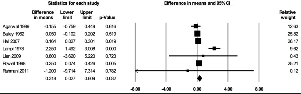 The meta-analysis for height included seven studies [29, 36,53,57,73,76,78]. In the random-effects meta-analysis including all seven studies ( Figure 2 ), school feeding resulted in a statistically significant increase in height; participants who received school feeding gained, on average, 0.318 (95% CI = 0.027, 0.609; P = 0.032) centimeters greater heights over 12 months compared to the those in the control groups. No publication bias was detected using the funnel plot (Figure S1 in the Online Supplementary Document ). The positive effect on height was robust to the removal of any particular study; the estimates with one study removed ranged from 0.141 (95% CI = 0.054, 0.228; P = 0.002) centimeters with Lampl 1978 removed to 0.463 (95% CI = 0.043, 0.883; P = 0.031) centimeters with Bailey 1962 removed. The effect on height was stronger in RCTs (mean difference = 0.858; 95% CI = 0.312, 1.403; P = 0.002) than in CBAs (mean difference = 0.050; 95% CI = -0.359, 0.460; P = 0.81) (Figure S2 in the Online Supplementary Document ), and stronger when formal meals (breakfast, lunch, or dinner) were provided (mean difference = 0.586; 95% CI = 0.109, 1.063; P = 0.016) than when snacks were provided (mean difference = 0.111; 95% CI = -0.362, 0.584; P = 0.65) (Figure S3 in the Online Supplementary Document ). The certainty of the evidence for height was rated as moderate.