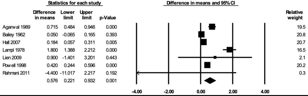 The meta-analysis for weight included seven studies [29, 36,53,57,73,76,78]. In the random-effects meta-analysis including all seven studies ( Figure 4 ), school feeding resulted in a statistically significant increase in weight; participants who received school feeding gained, on average, 0.576 (95% CI = 0.221, 0.932; P = 0.001) kilograms more weights over 12 months compared to the those in the control groups. No publication bias was detected using the funnel plot (Figure S5 in the Online Supplementary Document ). The positive effect on weight was robust to the removal of any particular study; the estimates with one study removed ranged from 0.327 (95% CI = 0.080, 0.573; P = 0.009) kilograms with Lampl 1978 removed to 0.721 (95% CI = 0.265, 1.177; P = 0.002) kilograms with Bailey 1962 removed. The effect on weight was stronger in RCTs (mean difference = 0.993; 95% CI = 0.433, 1.554; P = 0.001) than in CBAs (mean difference = 0.308; 95% CI = -0.140, 0.756; P = 0.18) (Figure S6 in the Online Supplementary Document ), and stronger when formal meals were provided (mean difference = 0.904; 95% CI = 0.521, 1.287; P < 0.001) than when snacks were provided (mean difference = 0.123; 95% CI = -0.303, 0.550; P = 0.57) (Figure S7 in the Online Supplementary Document ). The certainty of the evidence for weight was rated as moderate.