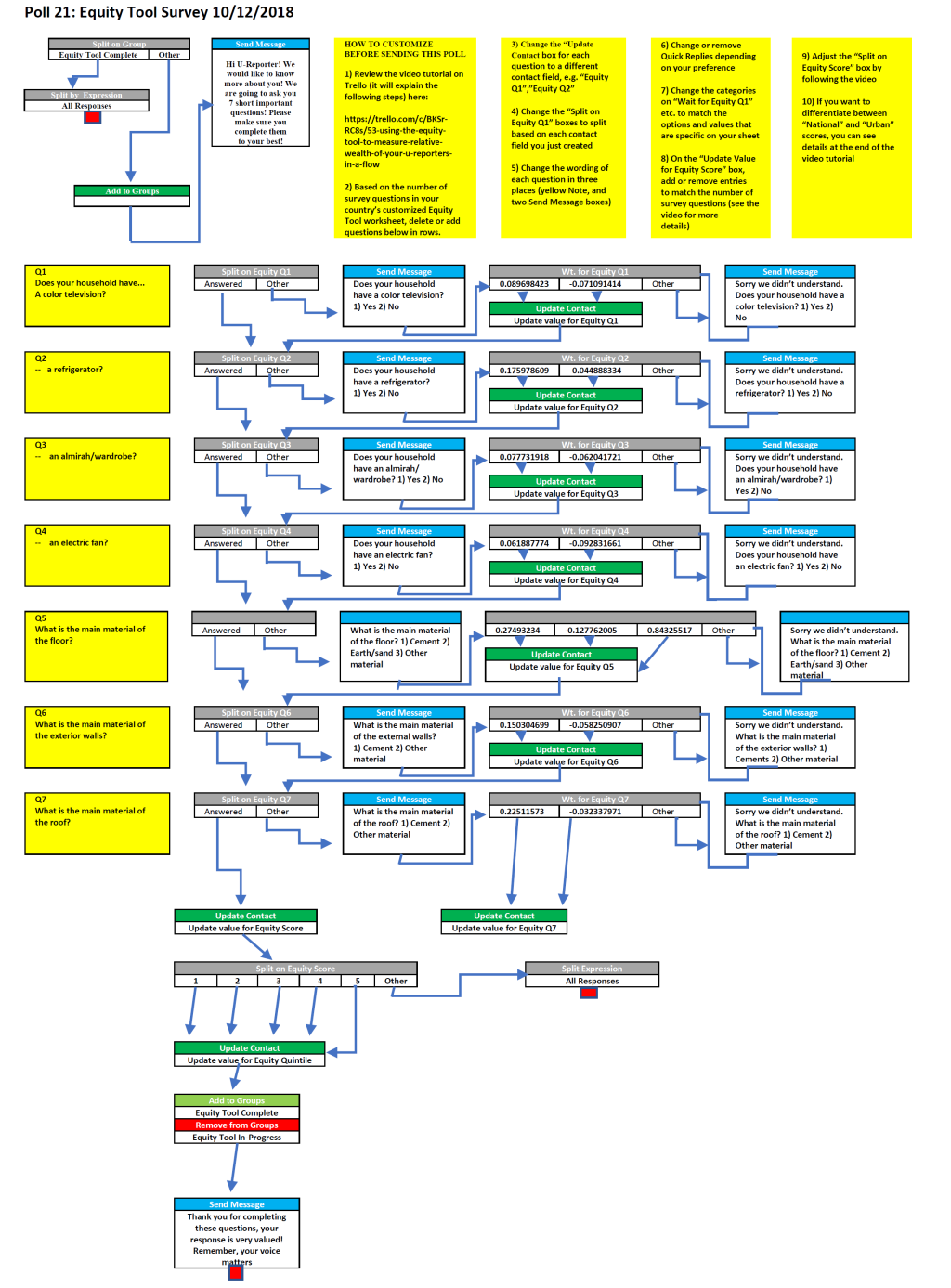 With the knowledge of each respondents’ wealth quintile assigned to their profiles, we can build a sample of U-Reporters representing equitable wealth distribution for each country participating. This was accomplished by a newly developed RapidPro flow ( Figure 3 ). Importantly, RapidPro is a multi-tenant system whereby each U-Report country has their own workspace based on the core RapidPro software, as such a flow created in one can be easily imported and adopted in another, creating ideal conditions for portability and scale up. Therefore, each flow can easily be deployed by U-Report project managers responsible for their country after they have implemented their own EquityTool surveys.
