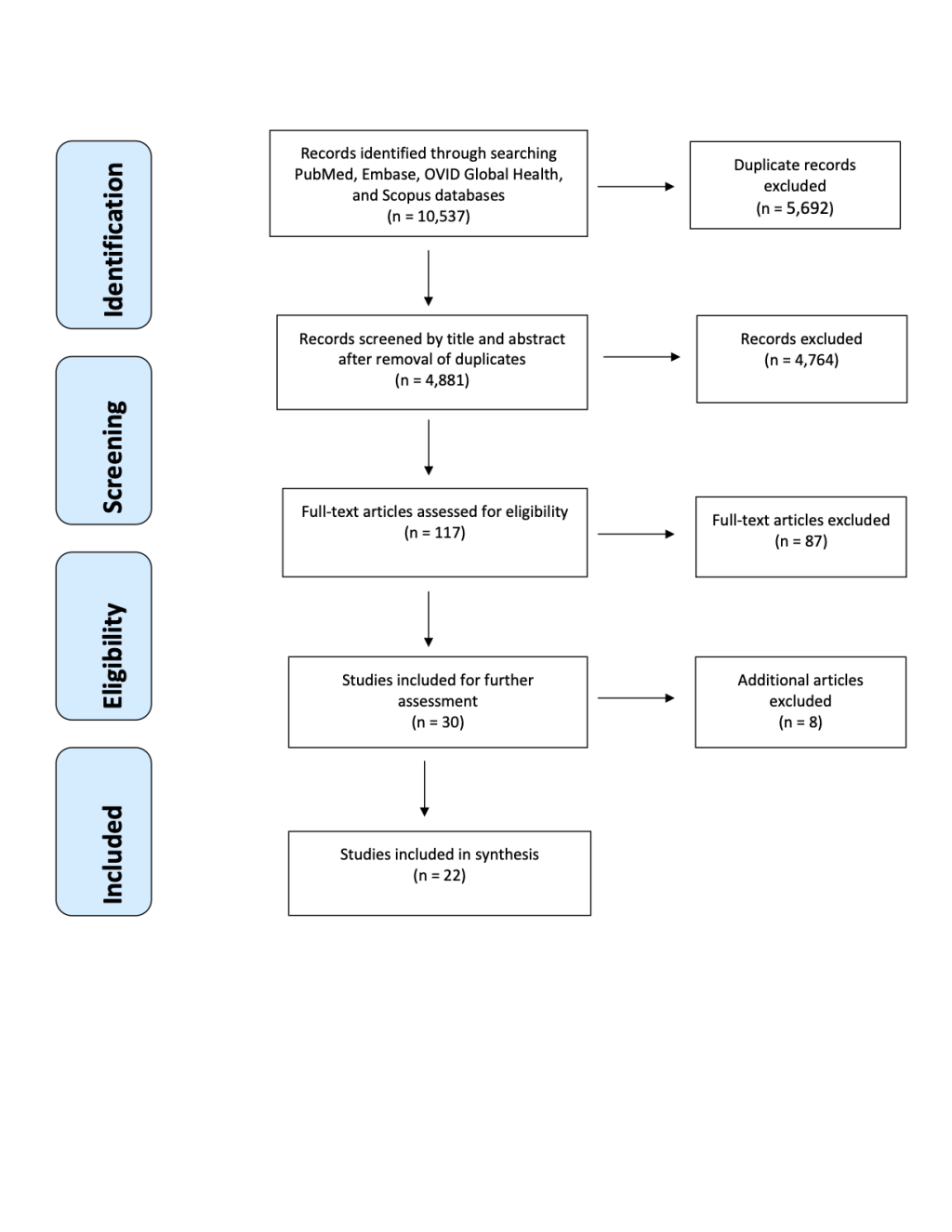 The search yielded 10 537 articles published through June 3, 2020. Initial screening identified 5692 duplicates, which were removed; 4881 studies were screened by title and abstract. Of these, 117 studies were assessed for eligibility in the full-text screening phase, of which 87 studies were excluded because they did not meet one or more of the eligibility criteria, leaving 30 articles for the data extraction phase. An additional 8 articles were removed after data extraction following a stricter assessment of the eligibility criteria, leaving 22 studies that were included for final assessment. Figure 1 shows the PRISMA flow diagram, indicating the sequence of inclusion and exclusion of articles.