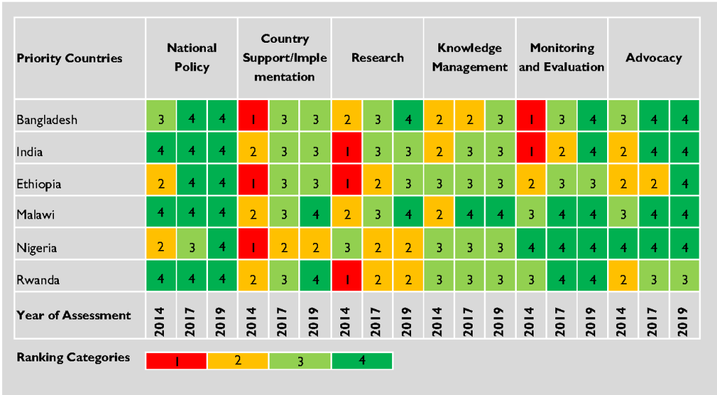As KMC services are offered more widely in each country, there is a need to collect, review and use KMC data in a systematic way to monitor progress, identify gaps and improve the quality of KMC services. All six priority countries have developed KMC-related indicators, although the interface for and frequency of reporting varies. Five priority countries (Malawi, Nigeria, Rwanda, Bangladesh and Ethiopia) monitor KMC services through their corresponding HMISs. India and Bangladesh achieved the most progress between the first and the last assessment. In India, in 2017, indicators were just being developed; by 2019, 782 facilities were reporting monthly on six KMC indicators through an online tracking system. In Bangladesh, in 2017, KMC indicators were being incorporated into the DHIS2 and a monthly KMC reporting form was implemented. By 2019, the DHIS2 was used to report on seven indicators related to KMC as well as ambulatory KMC follow-up data.
