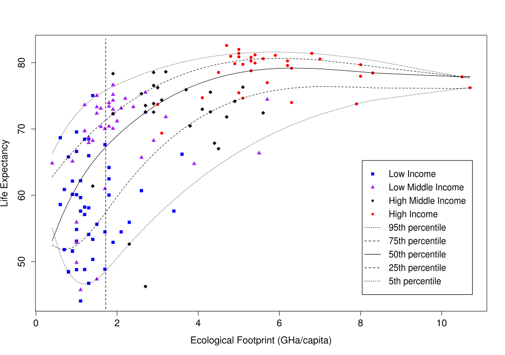 Countries’ average life expectancies rapidly increase with an increasing ecological footprint, and plateau (or perhaps decline slightly) after a GHa/capita of about 6. The median regression curve (solid black line), suggest a sustainable average life expectancy of 68 years, The countries with the highest average life expectancies (>80) are all high income countries, with a mean ecological footprint of 5.5 GHa/capita or three times the sustainability threshold.