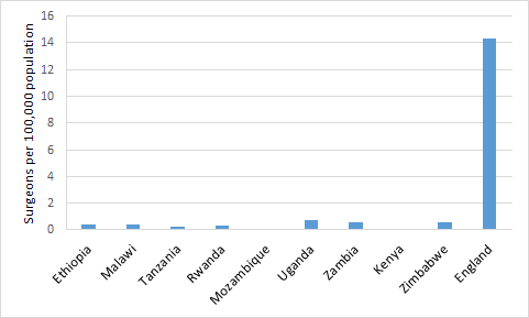 The lack of human resources, infrastructure and facilities means the need for surgical services is immense. Most district hospital operating theatres in Malawi do not have dedicated staff and half lack adequate instruments, including sutures, for common surgical procedures [10]. In Chad, Madagascar, Niger, Burkina Faso and Ethiopia, Caesarean–sections only account for 0.4–1.0% of all births, while the general consensus for an ideal global Caesarean section rate is 10–15% [5]. This suggests that this life–saving procedure is not available to most expectant women, and must be a key reason why women in sub–Saharan Africa have an adult lifetime maternal mortality risk of 1 in 38, compared with 1 in 3700 in developed countries [11].