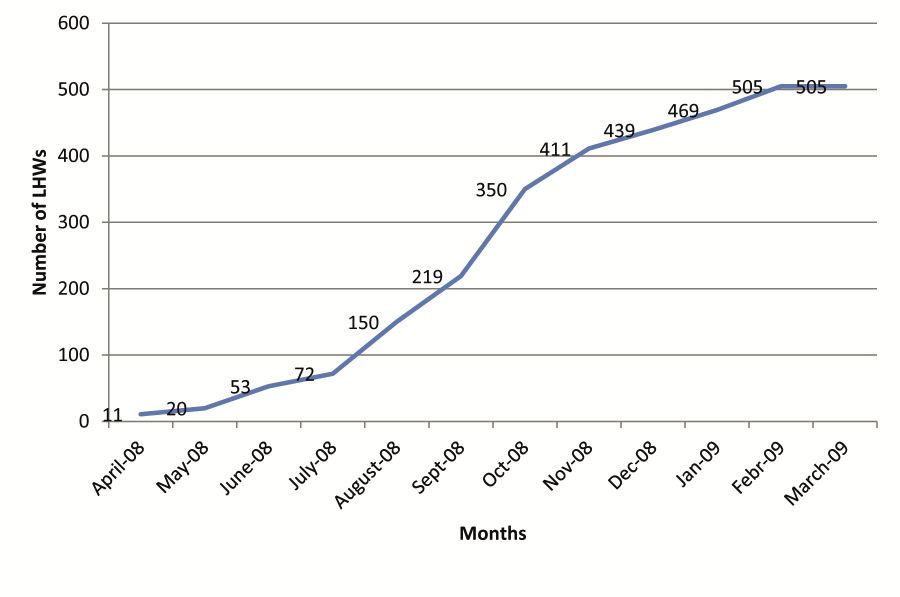 Besides increase in care seeking for pneumonia from LHWs, in one year period the number of LHWs treating children with pneumonia increased from 11 in April 2008 to 505 in March 2009 ( Figure 2 ).