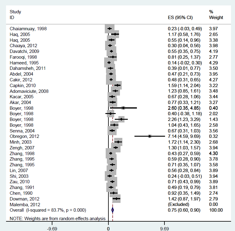 In our study, the majority of studies were from mainland China, with additional studies from Taiwan and Hong Kong. Mexico, Turkey, Iran, India, Pakistan, Philippines and Russia were also represented through multiple studies. The median year of publication was 2004, making the estimate useful for application to both the world population in 2000 and 2010. Twenty–one studies used the ARA criteria, and all the remaining studies used the 1987 revised ACR criteria. Some studies had multiple cohorts. Each cohort was recognised separately during analysis, so that the final 48 studies resulted in 60 cohorts. In case of the African region, only two studies were found from the entire region that fulfilled the criteria for inclusion. One of the studies had a very small sample size and did not find a single case of RA, so it was excluded as uninformative. The other study had a crude prevalence rate of 1%, but we felt that it would be inadequate to base an entire regions' prevalence rate on a single study. Therefore, we decided to discard both of those studies and replace them by Bowman’s systematic analysis in 2012 [20]. Bowman included all the studies ever conducted in Africa in his estimate, irrespective of the year of study, and the prevalence rate from his study was then applied to the population statistics of the region in 2000 and 2010.
