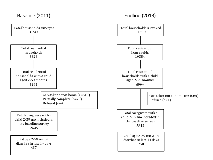 All households within the selected project areas were eligible for inclusion in baseline and endline surveys. Applying seasonal two–week diarrhea prevalence to the required sample sizes, we determined that 2400 and 4995 households of children 2–59 months of age should be visited at baseline and endline, respectively. We divided the number of households equally across the 15 intervention districts because it was critical for the evaluation to have adequate representation from each of the 15 districts. For each district, we ascertained a list of villages from the 2001 census (the most recently available with village–level population data) and randomly selected villages using a population proportionate to size (PPS) sampling strategy. In each village, we limited the number of households screened for inclusion in the survey to 25 at baseline and 50 at endline. The random selection of endline villages was independent of baseline.