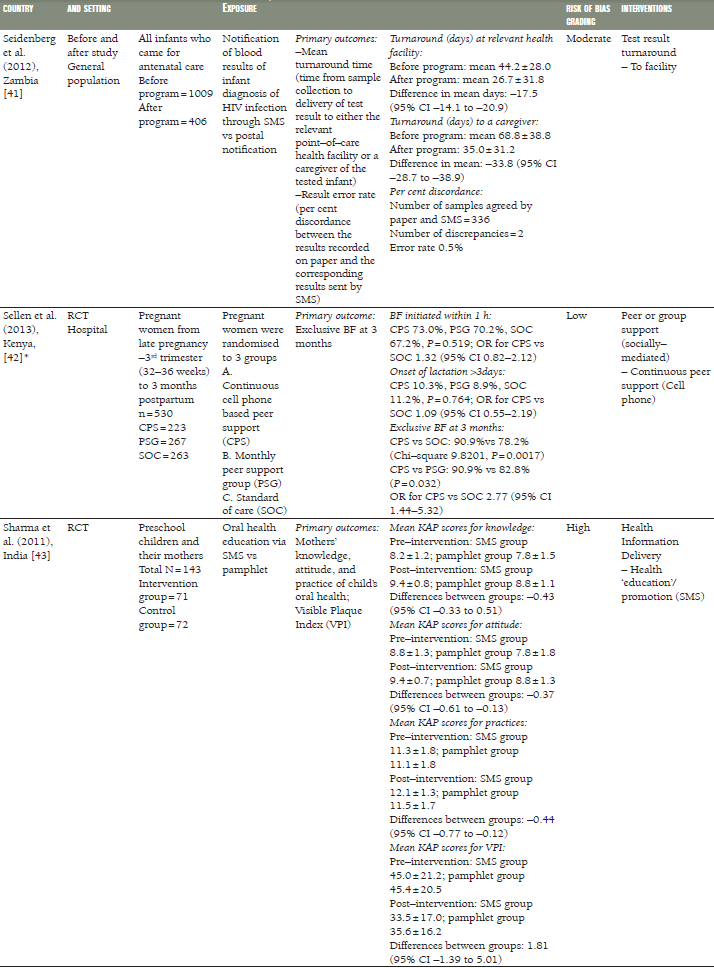 A quasi–experimental study from Mali of children aged 0–72 months [44] did not reveal differences in the incidence of childhood diseases between those whose health care data and diagnosis were recorded and transferred using mobile phone compared to children whose data were not recorded using mobile phone ( Table 1 ).