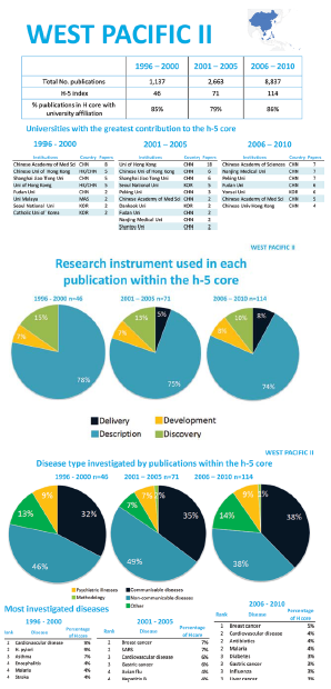 On reviewing the research topics that occur in the h–core of the regions, it can be noted that Africa and South–East Asia are the only two regions where communicable diseases remain proportionally the most studied in the 2006–2010 time–period. The Eastern Mediterranean, America II and West Pacific II regions can be seen as transitioning from their historic focus on communicable diseases to NCDs, whilst Europe and America I have a very similar distribution of research throughout. Regarding research instruments (“domains”), both Rudan et al. and Leroy et al. proposed that too much research funding may be allocated to the development of new interventions, which could not be as effective in reducing child mortality as implementing the existing interventions effectively [15,19]. It is, therefore, pleasing to see an increase in research related to delivery of interventions, whilst research relating to novel discoveries is decreasing, thus achieving a more desirable balance. In Africa in particular, research on delivery of public health interventions is increasing in both quality and quantity, demonstrating the capacity in this region to improve implementation of available interventions.