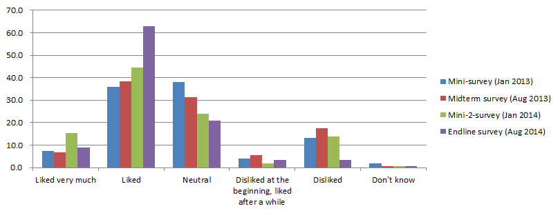 After governmental approval, the YYB supplier changed from “Tian Tian Ai (天添爱)” to “Fu Ge Sen (福格森)” and YYB was re–supplied from March 2014 onward. In June 2014, we carried out a three–day training sessions to retrain all the village doctors in the intervention county to strengthen their YYB related knowledge, health education and complementary feeding skills. Most village doctors in the training sessions said that the taste of the new YYB was much better than before and that children in their village liked YYB more which was reflected by a decrease in the proportion of children who disliked YYB at the time of the endline survey in August 2014 (23 months later survey) ( Figure 3 ). Also at the endline survey high adherence to YYB increased significantly ( Table 3 ). However, because the proportion of caregivers who forgot to give YYB continuously increased ( Figure 2 ), we advised the local MCH hospital to continue using multiple channels to promote caregivers’ awareness of the program.