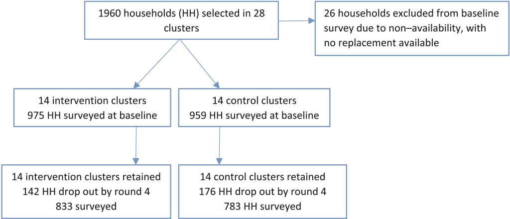 Representatives of the clusters, drawn from SEWA’s membership–based health cooperative, provided approval prior to randomisation. A board constituted by SEWA’s Health Cooperative Executive Committee and the Ethics Committee of the London School of Hygiene and Tropical Medicine granted ethical approval for the intervention, evaluation and qualitative research. In light of low literacy levels in the study area, all households provided oral informed consent to participate in the survey, as approved by the local ethics board. The study was registered as ISRCTN21290274. Reporting follows the CONSORT guidelines and extension for cluster randomised trials.