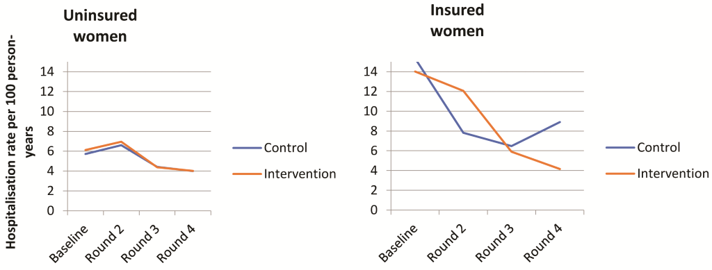 The post–intervention hospitalisation rate for the three conditions was 2.7/100 person–years in the intervention arm, compared to 2.4/100 person–years in the comparison arm. After adjusting for insurance status, rural/urban location, survey round and baseline hospitalisation rates, there was no evidence of an intervention effect on hospitalisation rates for the three conditions ( Table 5 ). There was no evidence of effect modification by insurance status (P = 0.91) or by rural/urban location (P = 0.18). Adjusting for imbalanced demographic characteristics identified at baseline and other potential covariates did not result in an important change in the point estimate or improve statistical efficiency (data not shown). Among initially insured women, hospitalisation rates decreased by approximately half in both intervention and control areas compared with pre–intervention rates, with smaller decreases observed among uninsured women ( Figure 3 ).