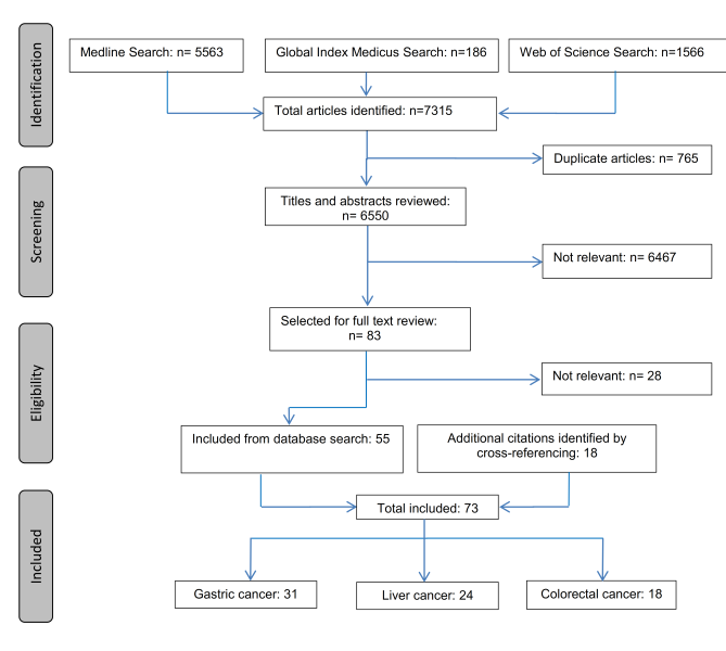 We included studies that aimed at evaluating strategies for prevention of gastric, liver and colorectal cancer in developing countries. We only included studies on humans published in English. We focused on studies that reported disease–related outcomes such as long–term health outcomes (eg, reduction of incidence or mortality) or intermediate outcomes that are expected to be associated with long–term effects (eg, detection rates or vaccine efficacy). Accordingly, we excluded non–original articles (eg, case reports, commentaries, guidelines etc.) and studies that were restricted to health behavior.