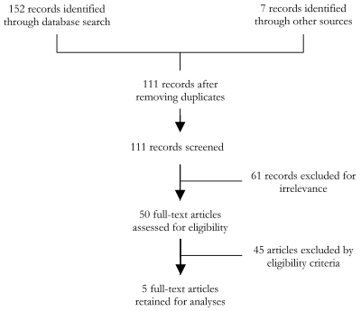 The literature search identified 111 records for screening after excluding duplicates. Of these, 50 articles were reviewed fully, and 5 articles were ultimately identified as meeting our strict eligibility criteria [7,14–17]. This is shown in Figure 1 .