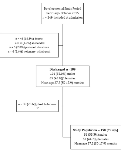 Our study period was 3 months shorter than the F75 trial. In this period a total of 249 children were included, 46 (18.5%) died and 189 were discharged to community care; 39 (20.6%) children were lost to follow–up at discharge. Reasons for loss to follow–up at discharge included that some parents wanted to leave the hospital before the developmental assessment could be done and the unavailability of our research assistant. Figure 1 shows the flowchart for data collection. Our final study population included 150 (79.4%) children discharged after an admission with SAM to outpatient–based care with a mean age of 27.2 months (standard deviation (SD) 17.9). In our study population, 83 (55.3%) were boys, 27 (18%) had pre–existing ND and 34 (22.7%) had a concurrent HIV infection.