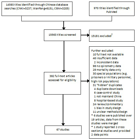 We used CNKI, WanFang, CBM and PubMed academic databases to retrieve publications on COPD prevalence in China. Parallel searches of the databases were conducted by two independent trained reviewers (Chinese databases: XL and WC; English databse: KYC and ANP). The search was limited to studies published between 1990 and 2014 ( Figure 1 ). The initial screening of the four databases returned 5237 results from CNKI, 6151 from the WanFang, 3205 from CBM, and 970 from PubMed, respectively. 382 studies were retained after excluding duplicates within and between databases, studies with no numerical values, studies conducted outside mainland China, review articles, viewpoints, conference abstracts. The process is documented in detail in Figure 1 .