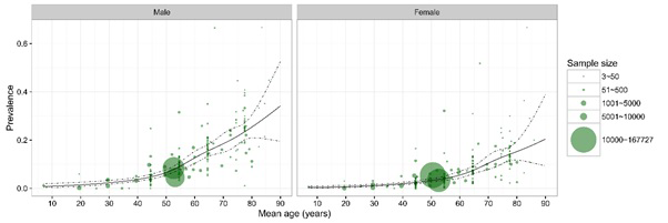 In the data extraction procedure, individual studies were used to provide multiple data points which contributed to the overall data set. To take into account the sample size and the availability of different data points from the same study, a multilevel mixed–effect logistic regression was adopted with a restricted cubic spline [30,31]. This was then used to model the COPD prevalence as a function of age. Based on a total of 419 data points extracted from 67 studies with spirometry–based diagnosis of COPD, the gender– and age–specific prevalence of COPD in China was estimated. We further estimated the corresponding 95% confidence intervals (CIs) by applying the semiparametric bootstrapping method [32].