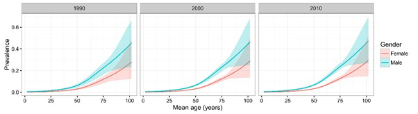 After applying the estimates of age– and gender–specific COPD prevalence on UN Population Division's demographic data, the prevalence of COPD in populations aged <20 years and ≥80 years were calculated. From 1990 to 2010, the changes in the gender–specific COPD prevalence across all age groups are shown in Figure 5 and Table 1 . Over the 20 years considered in this analysis, the prevalence of COPD increased slightly in both males and females, which was also indicated in the model formula, where the annual rate of change in prevalence on a log odds scale was only 0.004. In 1990, the prevalence of COPD ranged from 0.49% (95% CI = 0.29–0.85) in younger people aged under 20 years to 20.95% (95% CI = 14.04–27.04) for those who were 80 years of age or older, and the overall prevalence was 2.70% (95% CI = 1.86–3.51). In 2010, the prevalence of COPD ranged from 0.55% (95% CI = 0.37–1.04) in people aged under 20 years to 22.89% (95% CI = 18.13–28.96) in people aged 80 years and above, with the overall prevalence in the Chinese population increasing to the level of 3.84% (95% CI = 3.30–4.77). The COPD prevalence between males and females differed consistently from 1990 to 2010, where the prevalence of COPD in males was around two–fold higher than in females, and this difference increased with increasing age. During 1990 to 2010, the overall prevalence of COPD increased by 42.22%. The most significant increases were in younger population who were under 20 years (12.24%) and older population aged 80 years and above (9.26%). The increasing rates were similar in males and females.