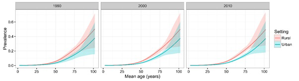 A total of 56 studies provided the setting–specific prevalence information. The comparison of COPD prevalence between urban and rural dwellers in the years 1990, 2000 and 2010 is presented in Figure 4 . Similar to the comparison of gender–specific prevalence, there was a marked difference in COPD prevalence between urban and rural dwellers, where people in rural areas had higher COPD prevalence than those in urban areas.