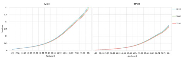 The 67 retained studies incorporated 759 461 people tested for COPD, 45 197 of whom were diagnosed with COPD using the spirometry method. Across most of the age spectrum in adulthood (20 years and more), there were large sample sizes providing substantial numbers of data points, except for the very old age (>80 years). A total of 47 studies provided the gender–specific prevalence information. Figure 2 shows the gender–specific relationship between the COPD prevalence and age, based on all the informative data points. Generally, the prevalence of COPD increased steadily with age in both males and females. In males, it reached a prevalence of about 25% by the age of 80 years, and in females it was about twice less prevalent. Based on the information from the 47 studies, the estimates of COPD prevalence for males and females in the years 1990, 2000 and 2010 are shown in Figure 3 . Across all three years, the prevalence of COPD was consistently greater in males than in females, and the difference was most pronounced in older adults.