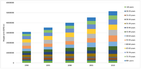 In view of the relation between COPD prevalence and age, our study confirms that COPD is a progressive and degenerative disease [11,33]. By estimating the prevalence of COPD in the Chinese population over the full age–span, we enabled a public health approach to prevention and treatment of COPD in younger population. It was important to note that COPD can also exist in early life, as suggested by previous studies [24,25]. Younger populations should therefore not be excluded from COPD screening programs. In our study, although the number of COPD people in <20 years decreased slightly during 1990 to 2010, the prevalence rate kept increase. Early diagnosis is very important, and disease–modifying therapies that can delay onset could have considerable potential for reducing age–specific prevalence [34].