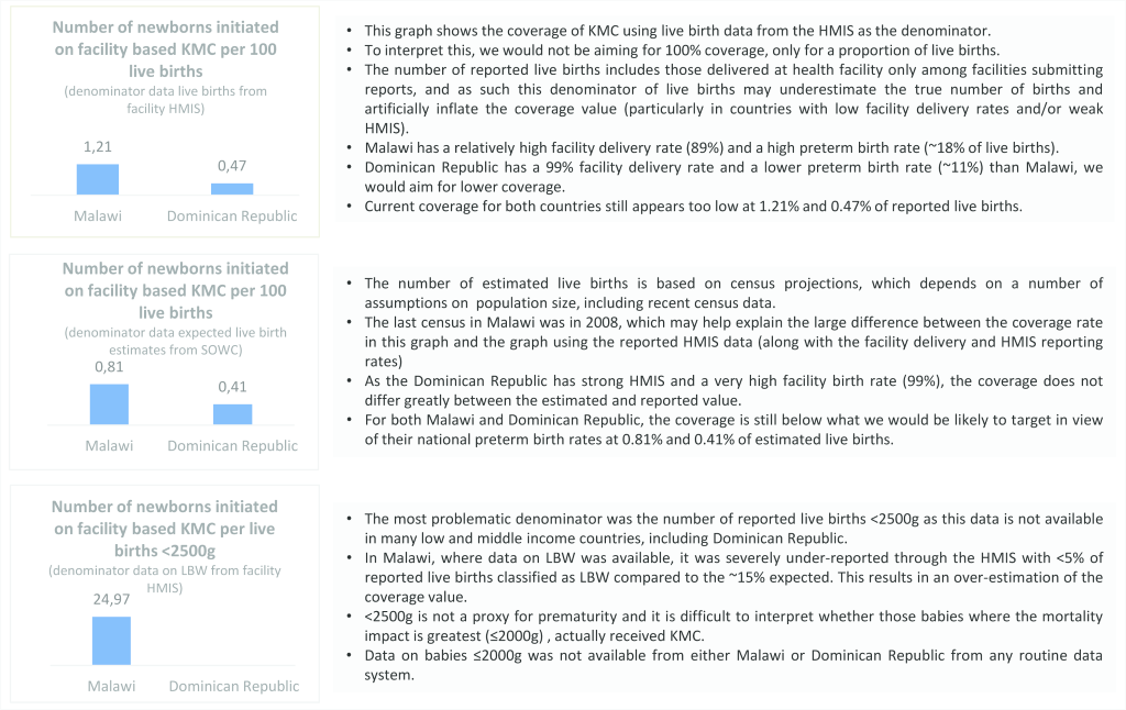 As a preliminary exercise, the task team approached a select few LMIC countries for data on the KMC numerator, which is available through a limited number of HMIS and many hospital registration systems. To demonstrate the numerator with different denominator options, task teams present three graphs showing the proposed numerator over total reported live births, total reported live births <2500 g and estimated live births for two countries, Malawi and Dominican Republic ( Figure 4 ).