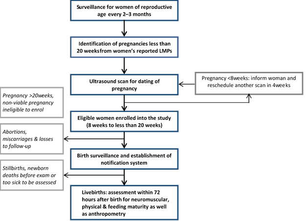 Eligibility. Trained fieldworkers use a variety of methods to identify pregnant women for the study. Women either directly report their pregnancies or the fieldworkers elicit missed periods from women’s reported dates of their LMP. They also conduct pregnancy tests, if required, to confirm pregnancies. In Zambia, over 96% of all pregnant women attend antenatal care (ANC) clinics so study participants are recruited from these clinics. The study enrols women only if their pregnancies are between 8–19 completed weeks by ultrasound examination. This window ensures that pregnancies are early enough to give accurate ultrasound gestational age estimates but also excludes very early pregnancy losses due to genetic or chromosomal abnormalities. Enrolled women should also be willing to be available for the gestational age assessment to be conducted on their babies within 72 hours after birth.