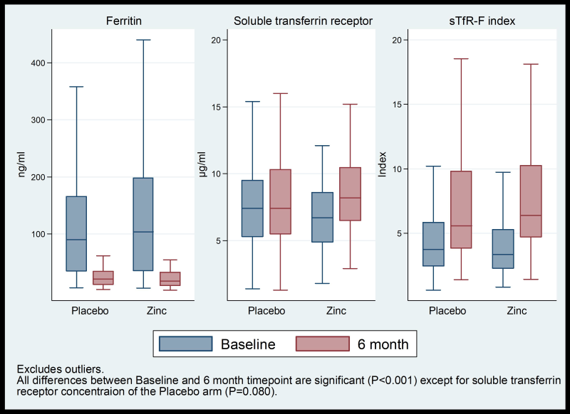 Changes in plasma zinc, ferritin, sTfR, sTfR-F, and CRP concentrations between baseline and six months were tested using Wilcoxon matched-pairs signed-ranks test.