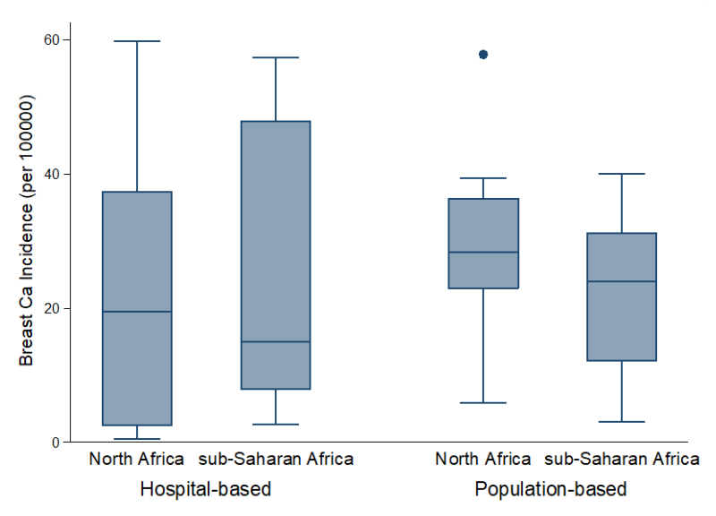 Our study showed that population-based cancer registries remain the main sources of data on breast cancer in Africa as these provided 67% of data in this study. Current data from most hospital-based cancer registries are rather too incomplete and inconsistent to be deployed in the understanding of cancer epidemiology in Africa [12], as evidenced from the quality assessment. In the population-based registries, we observed that the estimated regional variation in breast cancer incidence in Africa was consistent with the GLOBOCAN 2008 and 2012 studies, with the incidence in North Africa higher than observed in SSA [6,9]. The estimated incidence of breast cancer in North Africa (29.3 per 100 000) was almost same as values reported by the global burden of diseases (GBD) collaborators for the region (29.7 per 100 000) [2]. However, the GBD collaborators noted a relatively higher incidence rate in SSA in 2015 at 34.1 per 100 000 compared to our estimate of 22.4 per 100 000 (95% CI 17.2-28.0) for SSA [2]. The GBD estimates are thus suggestive of a higher incidence of breast cancer in SSA compared to North Africa, which are in contrast to our findings of the opposite, and possibly raises potential questions regarding the rising trend of breast cancer in SSA compared to North Africa. The differences may be partly attributable to sources and completeness of data, as well as modeling approaches employed in the GBD estimates compared to the present study. Although some previous reports have shown that the estimated incidence rates of breast cancer across North African states are higher than in SSA, and comparable to rates in some high-income settings [65-67]. The regional differences in Africa may be indicative of racial and ethnic disparities in invasive breast cancer epidemiology in the region, as already observed in the variations in incidence and mortality patterns between black and white women globally [68,69]. Dickens and colleagues noted that the clinical spectrum of breast cancer in Africa is highly heterogenous across population groups [70], with this often linked to variations in age at diagnosis, staging, time trends, and genetic and environmental risks [69,71]. Moreover, the different stages of fertility transition currently observed in Africa as evidenced by declining births and widening birth intervals across population groups may also be an important driver of the regional differences [71].