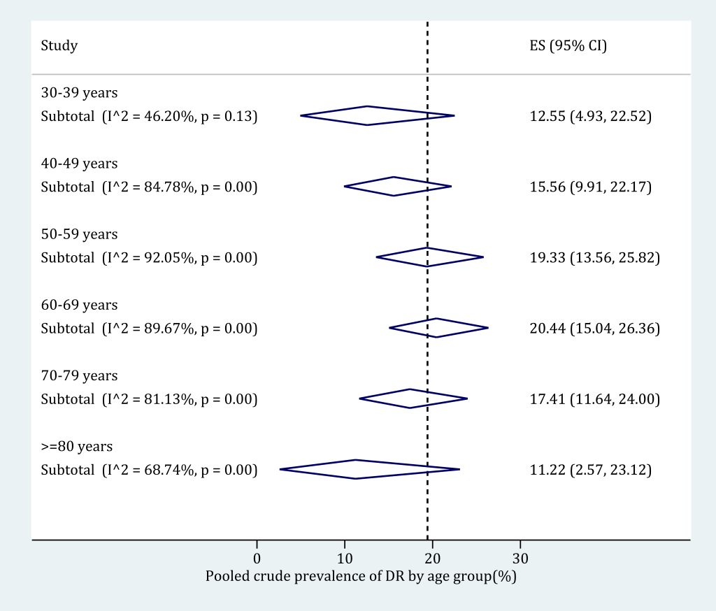 The age-specific prevalence of any DR in people with DM was derived based on subgroup meta-analysis (Figure 6). The following age categories were adopted: 30-39 years, 40-49 years, 50-59 years, 60-69 years, 70-79 years and 80 years and older. Before the age of 70 years, the prevalence of any DR in people with DM kept rising from 12.55% (95% CI = 4.93-22.52) in adults aged 30-39 to 20.44% (95% CI = 15.04-26.36) in those were 60-69 years old. Then the prevalence of any DR in people with DM started to decrease, until 11.22% (95% CI = 2.57-23.12) in elderly aged 80 years and above. The detailed process of synthesizing the prevalence of any DR in people with DM in each age category can be found in Figure S9 in Online Supplementary Document(Online Supplementary Document).