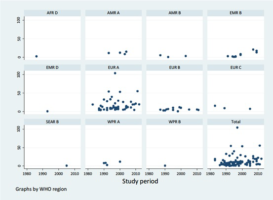 The numbers of studies conducted in declining order by decade were: 1990-1999 (36 studies), 2000-2009 (28 studies), 1980-1989 (14 studies), and 2010-2017 (5 studies). Most of the studies – 56 in total – were conducted in the European region (EUR A-39, EUR B-14, EUR C-3). Eastern Mediterranean Region (EMR) contributed 11 studies, American region (AMR) 8 studies, Western Pacific region 6 studies, while South East Asian (SEAR) and African regions (AFR) had only 1 study each. About two-thirds of selected studies were rated as high-quality with most of these (70.5%) conducted in the European region. See Appendix S1 in