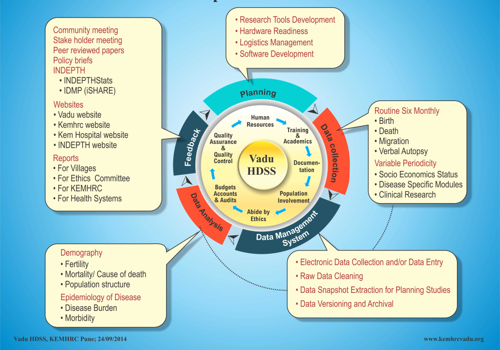 Vadu Health and Demographic Surveillance System (VaduHDSS), a surveillance system initiated in 2002, is run by Vadu Rural Health Program of the KEMHRC Pune. Every six month, the VaduHDSS collects data on pregnancies, births, marriages, migrations, deaths and assesses causes of deaths using verbal autopsies in a population of 160000 individuals residing in about 48000 households in 22 villages. By virtue of its longitudinal data generation practices the VaduHDSS facilitates national and globally relevant health research to generate evidence for informed health policy decisions.