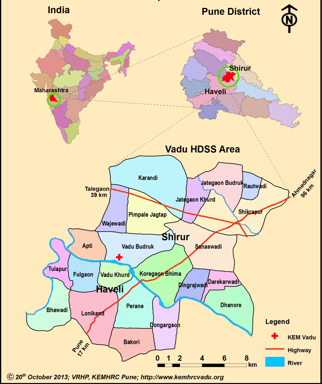 KEM Hospital (KEMH), a 106-year-old multi-specialty, 550 bedded, tertiary care hospital in Pune city [1], started providing primary health care to rural communities in and around Vadu village in the early part of the decade of 1970 as the area lacked adequate health care facilities. It started a secondary level health facility with support from public health systems by establishing a 30-bedded hospital named Shirdi Sai Baba Rural Hospital in 1987. In 1988, KEMH added a community-based outreach program [2], termed as Vadu Rural Health Program (VRHP), catering to the primary health care needs of the surrounding rural population simultaneously. To enhance the quality of health care, KEM Hospital Research Centre (KEMHRC), a sister concern of KEMH which focuses on research, started conducting health research in VRHP area in 1983 [3]. With an increasing realization of the importance of social determinants of health, there was a felt-need to better understand the complex interaction between socio-demographic characteristics and health at the individual and population level. With this in view, the Vadu Health and Demographic Surveillance System (VaduHDSS) was initiated in a geographically contiguous population of 50000 individuals covering 22 villages in 2002, with seed grant from the Gates Institute for Population and Reproductive Health, Johns Hopkins University Bloomberg School of Public Health. The overarching objectives of VaduHDSS are: