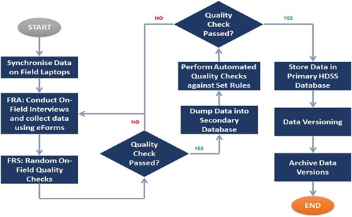 The first round of VaduHDSS data collection was in 2002. Initial rounds of HDSS data collection were paper-based followed by data entry using a FoxPro based software. With increasing availability of technology, we started electronic data capture using laptops in 2007. This was done using an application developed using PHP My Admin software for front-end application and MySQL database. Shifting from paper based to electronic data capture helped up to reduce data-entry errors and other errors due to built-in quality checks. Moreover, it has substantially reduced time and cost of data collection. In 2013, we started data collection on electronic tablet using an android application based on SQLite software, developed in house. Current data flow is described in Figure 5. From July 2019 we plan to move to more opensource platform “Survey solutions” for long term sustainability. Since 2009 we have initiated an open data access policy. Our data are available in public domain on the INDEPTH-iShare website along with the metadata, thus providing anonymized longitudinal microdata to researchers across the globe.