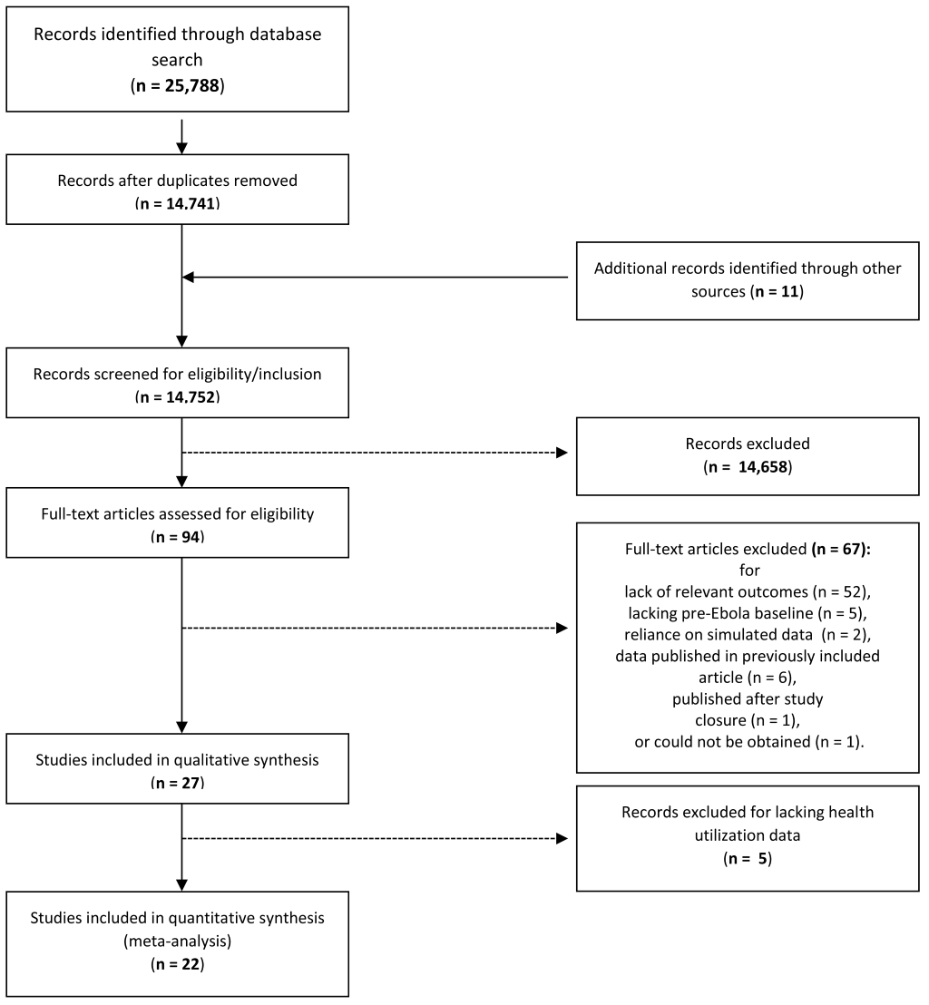 Two reviewers independently assessed the titles and abstracts for relevance and likelihood of meeting the inclusion criteria. Articles were excluded if 1) they did not contain quantitative empirical data documenting outcomes during an EVD outbreak and instead relied solely on simulations, mathematical models or qualitative data; 2) did not include comparison data from a pre-Ebola period or from a population not exposed to an EVD outbreak; or 3) did not include a health care utilization outcome other than EVD-related outcomes. One author, JW, supervised the title-abstract review process. The first 3000 citations were independently screened by JW and feedback was provided to reviewers. JW screened an additional sample of 3500 articles to ensure that all potentially relevant citations were included in full-text screening. JW did not identify any relevant citations missed by the reviewers. The title-abstract review identified 94 citations. Full-text articles were then extracted and assessed for inclusion by JW. A total of 26 relevant articles were identified. Reasons for exclusion at this stage included primarily lack of data on relevant outcomes, lack of a pre-EVD outbreak baseline measurement, and reliance on simulated data. Even though our search potentially included articles describing early EVD outbreaks (eg, the 2000 outbreak in Uganda), all remaining articles described studies conducted during the 2013-2016 West African EVD outbreak. One article recommended by an expert was excluded for being published after study closure. Figure 1 contains the flowchart describing these inclusions/exclusions according to PRISMA guidelines.