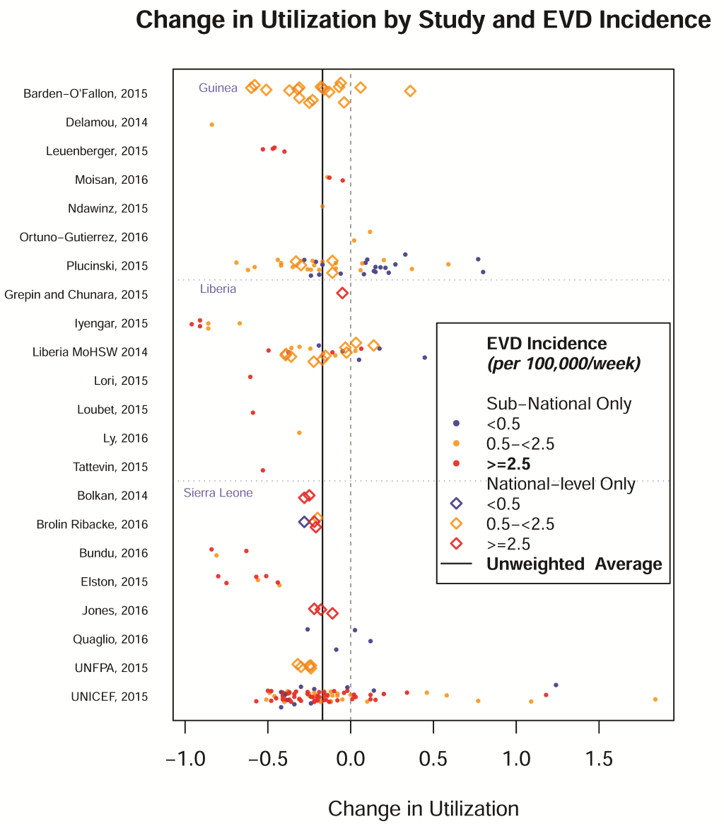 Other limitations were introduced by the methodology used in this literature review. Lacking data on facility catchment areas, we do not weight estimates to account for the population affected, nor do we control for the non-random distribution of study locations across the three countries. Double counting of data for the same services at the same facilities during the same periods does occur, which violates the assumption of independent errors and results in standard errors that are too small. However, overlap is most common for national-level estimates that include the same areas as sub-national data. After stratifying by level in Table 2, the effect of EVD on health care utilization remains significant. Overall, given the methodological limitations and presence of some bias, the estimates reported in this study should be taken as indications of the effect that EVD may have had on health services, rather than as precise estimates of that effect.
