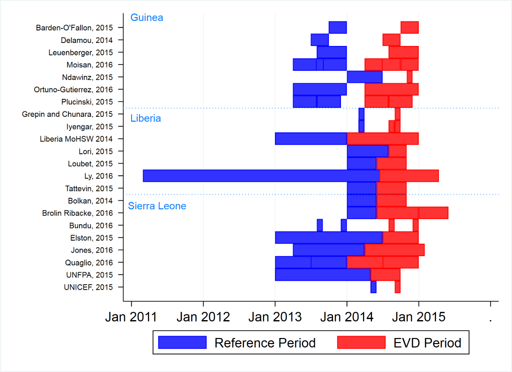 The mean duration of the Ebola period for estimates was 3.65 months (median: 3 months, IQR: 1-4 months). Ebola periods reported for estimates varied from Jan 2014 to May 2015 (Figure 3).; however, most estimates of utilization during the Ebola period come from April – December 2014, which contains peak transmission period for the three countries that occurred between September and December 2014 [44]. Baseline periods varied, but mostly fell between early 2013 and early 2014.