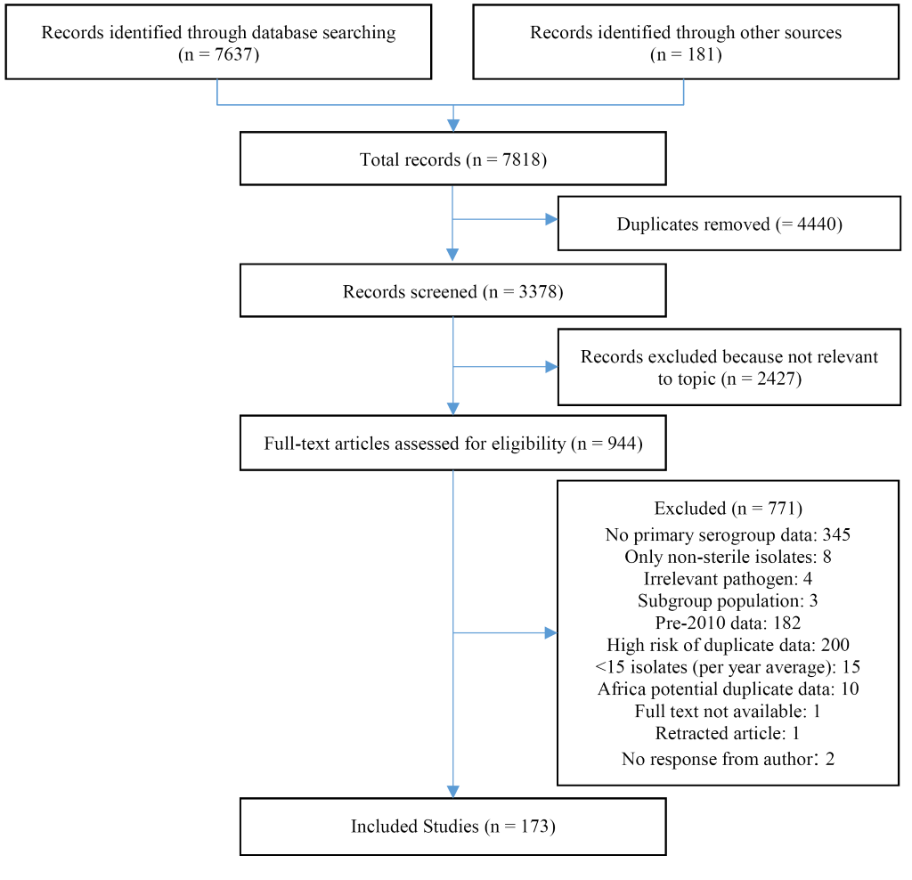 Studies or surveillance reports were included if they: reported meningococcal serogroup data from typically sterile sites in humans; clearly specified the number of samples tested and the serogroups identified; clearly described the time period and country of specimen collection; reported the majority of data between January 1, 2010 and December 31, 2016; and had a sample size of at least 15 (or an average of 15 per year if reporting for more than one year). Studies in all age groups were eligible for inclusion. Studies from outbreak periods were eligible for inclusion. Studies were excluded if they were conducted only in a select population (ie, patients with asplenia) or only tested for one serogroup.