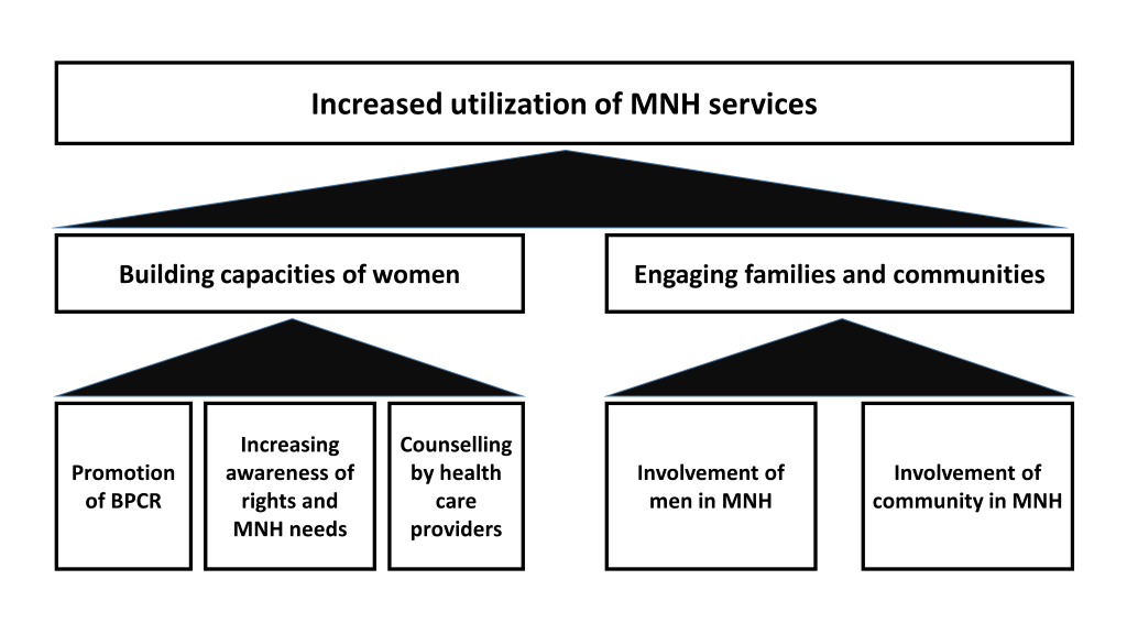 The programme aimed to build the capacities of pregnant women through birth preparedness and complication readiness (BPCR), increasing their awareness of the rights and needs associated with MNH, and increasing health care providers’ capacities to effectively counsel pregnant women and their families on MNH care.