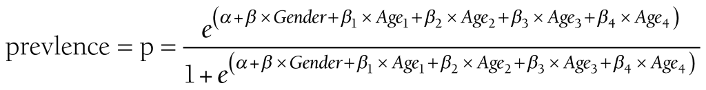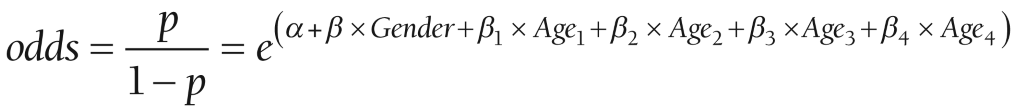 Logit (p) =α +β × Gender + β1 × Age1 + β2 × Age2 + β3 × Age3 + β4 × Age4