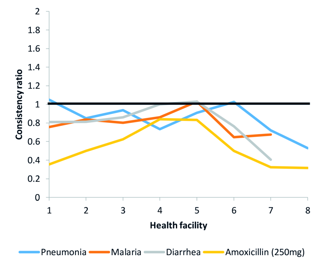 We also calculated consistency ratios for each indicator to describe data consistency between reporting levels for the indicators traced in the DQA. These measures assessed data accuracy throughout the system. For these ratios, a value of 1 indicated agreement between the two counts being compared. Consistency ratios greater than 1 indicated under-reporting and consistency ratios less than 1 indicated over-reporting. Reasons the data may not match across forms include errors in calculation or transcription, different interpretations of data to be reported, missing or illegible data, or corrections made to errors that occurred on one form but were not corrected on the other form. For example, we compared the values reported in the health facility monthly reports by the health facilities included in the DQA with the sum of the values that CHWs reported in their summary reports for three treatment indicators and an amoxicillin stockout indicator (Figure 5). Figure 5 shows that amoxicillin stockout was often over-reported to the next level.