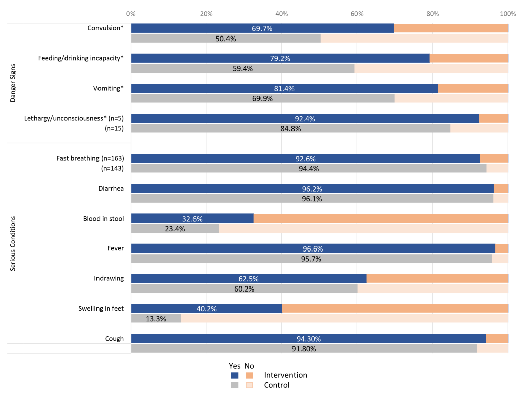 Most RCom performed well in correctly identifying the presence or absence of danger signs, with the most frequently missed serious conditions being chest indrawing, fast breathing and fever. The intervention group was more likely to incorrectly identify chest indrawing; while the control group was more likely to miss this sign. RCom also failed to recognize threshold values; for example, pulse was assessed correctly, but not assigned as a condition even when it exceeded the threshold. Additionally, results showed that the three screening questions indicating systemic involvement were not being asked; the extent of screening for illness severity appeared to be limited. The intervention group missed classifying (ie, diagnosing) a much smaller percentage of the four main iCCM danger signs including red MUAC (30.8% vs 71.4%), with missing the danger signs attributed to inadequate screening or low skill level.