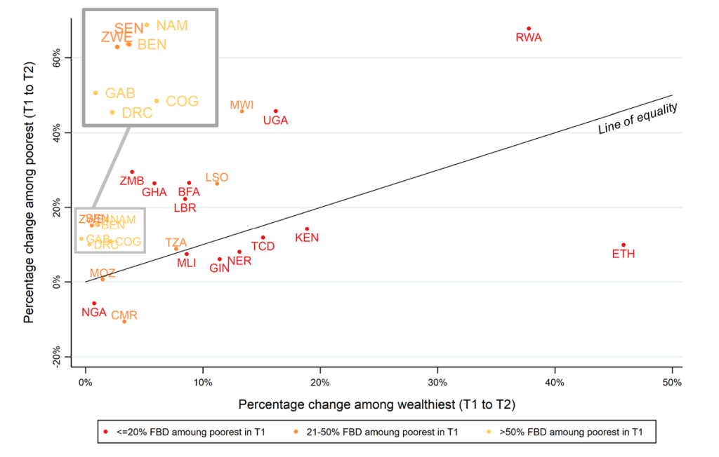 Figure 3 shows the comparison of trends in facility-based deliveries between time 1 and 2 by wealth. Countries above the diagonal line of equality had a faster rate of growth among women from the poorest than richest quintile (15 of the 25 countries). The colours of the labels indicate three levels of the percentage of women in the poorest quintile giving birth in facilities at time 1. Notably, both Rwanda and Ethiopia started at very low levels at time 1, but show different pathways of development to time 2. A larger increase among poorest women compared to wealthiest was seen in Rwanda (above the line of equality), and the opposite phenomenon occurred in Ethiopia (below the line of equality).