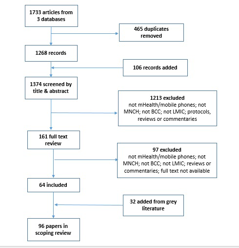 We reviewed all potentially relevant documents from the grey literature by title, abstract or executive summary (if available), or full text. We included documents that reported on the feasibility, evaluation or implementation lessons from interventions conducted in LMIC using mobile phone technology for BCC to improve home-based care practices and uptake of preventive health services for mothers and young children during pregnancy, infancy and the first five years of childhood. Media articles and blog posts were excluded, as were project briefs without any evaluation data or reflection on lessons learned. Only one grey literature document was included for each discrete mHealth project unless additional documents contributed unique findings.