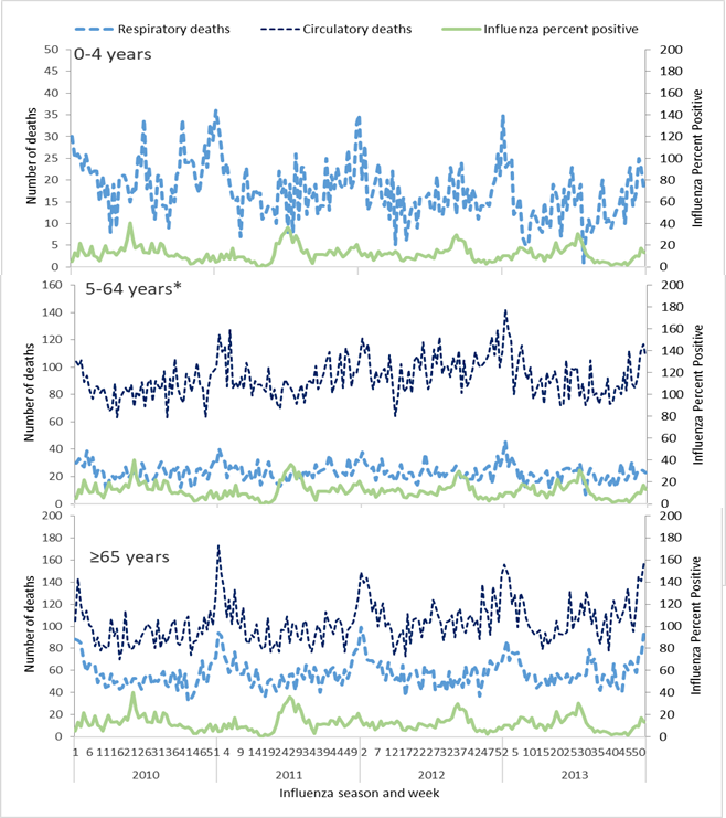 Although the influenza percent positive may vary between age groups, we utilized an overall influenza percent positive combining surveillance information for all age groups. This approach was selected because of potential biases in the surveillance data including who is enrolled in surveillance, health care seeking behaviours in the population, and limited numbers of specimens collected and tested for influenza by age group. By age group for the period of study, we graphed the weekly influenza percent positive along with weekly count of deaths coded as respiratory or circulatory (Figure 1).