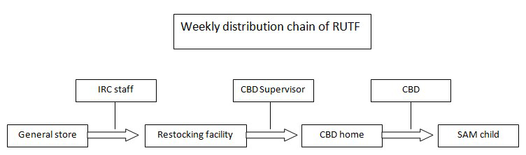 CBD supervisors, a pre-existing cadre from the iCCM program, were tasked with the distribution of ready-to-use therapeutic foods (RUTF) from centralized distribution points to the homes of the CBDs. Every month, IRC staff prepositioned RUTF at centralized storage facilities in each administrative unit (payam) the IRC operated the study in. Every week, the CBD supervisors retrieved RUTF at the storage facility closest to the CBD homes and replenished the RUTF stored at the CBD level. This way, considering the high value of RUTF in food-insecure South Sudan, the quantity of RUTF stored at the CBD home was kept to a minimum. They received an incentive of 50 USD, and an additional 15 USD for those who requested financial support for transporting the RUTF.